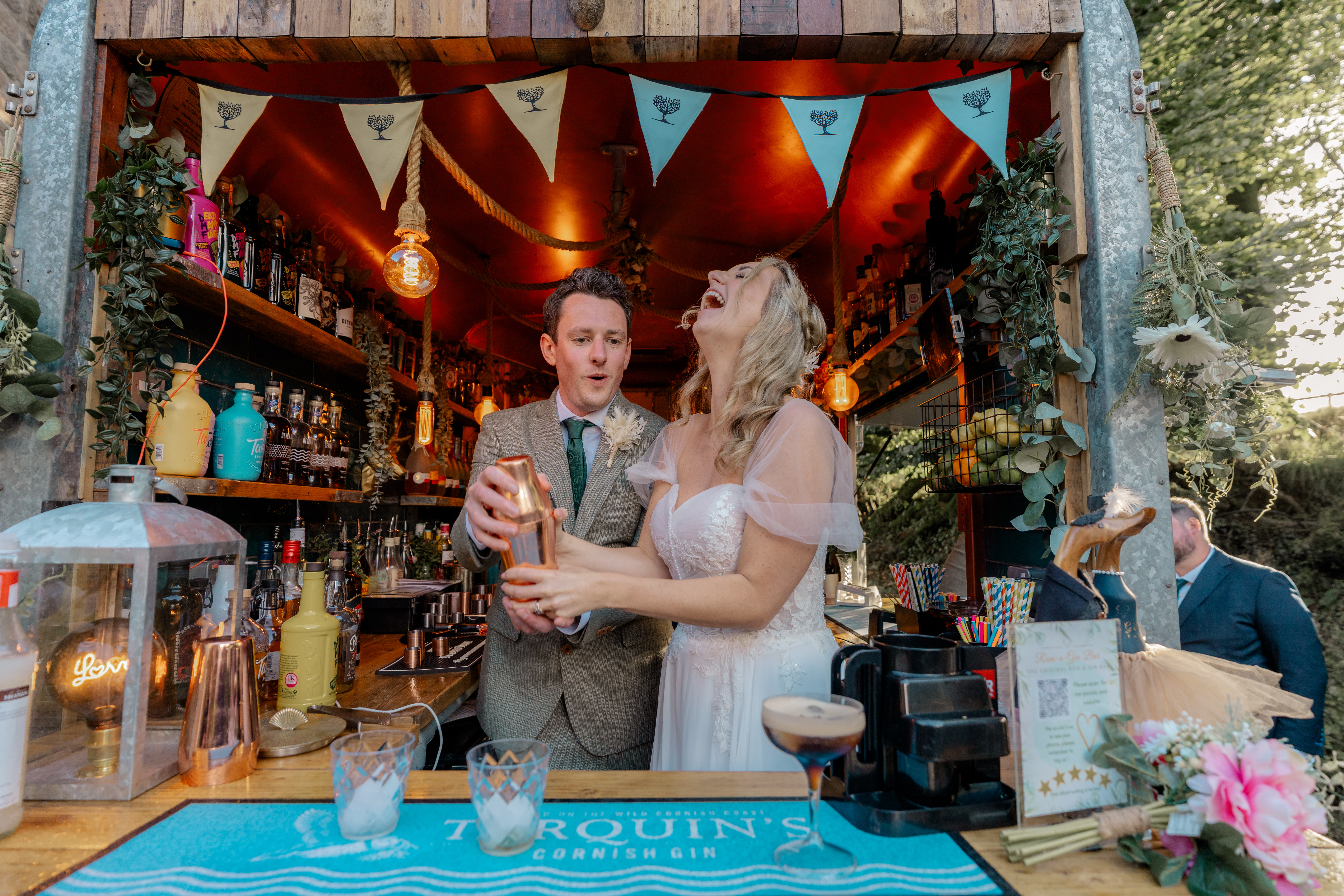 Helen and Steve delivered an amazing bar service for our wedding at Tregedna, Maenporth. We have seen so many mobile bars in white catering van trailers or set up on tables under gazebos - and indeed many of these styles of set-ups were actually more money to hire than Helen and Steve's beautifully converted horse box. From every angle the Rum and Gin Bar looked totally stunning. Thoughtful extras like seating for guests and the L-O-V-E light-up letters.